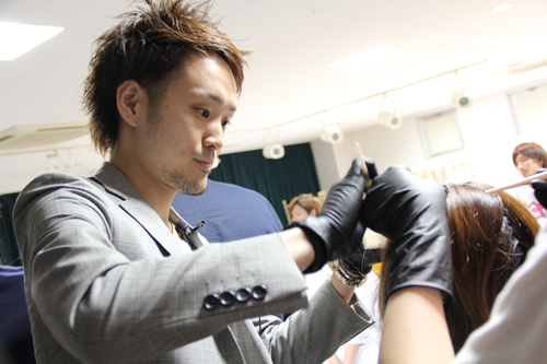 1stステージでは今年のトレンドカラーである「イノセントカラー」をワンメイクカラーで仕上げ、基礎技術を教えていただきました。
