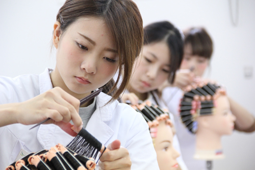 ヘアデザイン部門ではトップスタイリストコースの学生が色とりどりのカラーを行い、カットやヘアセットなどこれまでに習ってきた技術を活かしながら作品を完成させていきます。