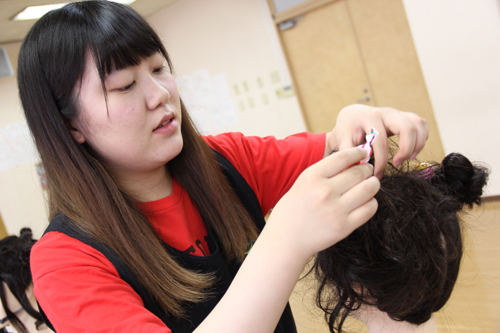 アップスタイル部門ではブライダルスタイリストコースの学生がこれまで学んできた基礎技術をしっかりと押さえ、それに編込みなどを加えながらアレンジしていきます。75分間で一人一人が自分のテーマに合わせ作品を完成させました。