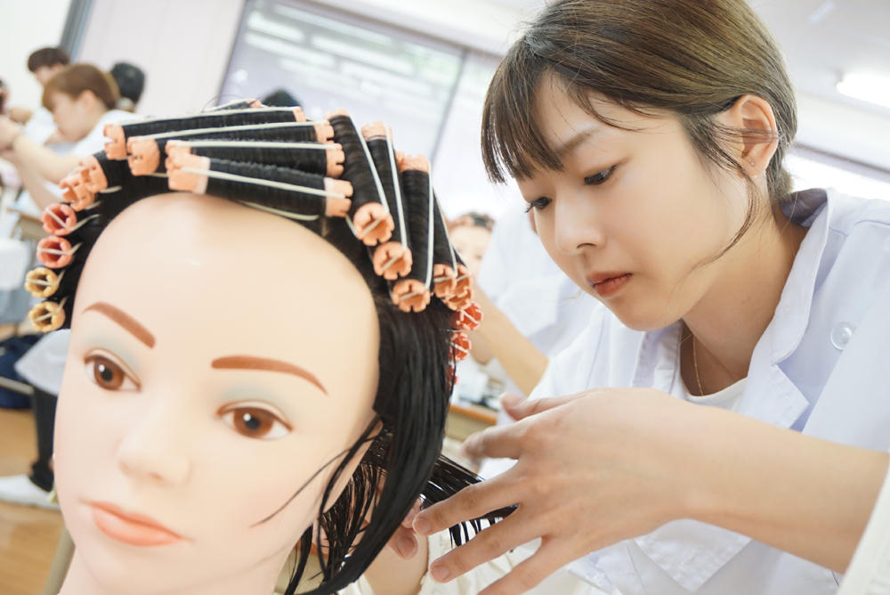 ワインディング部門では美容技術の基礎となるワインディングを行います。1年生はこの日のために一生懸命練習を行い、コンテストでは定められた時間内に完成させます。
