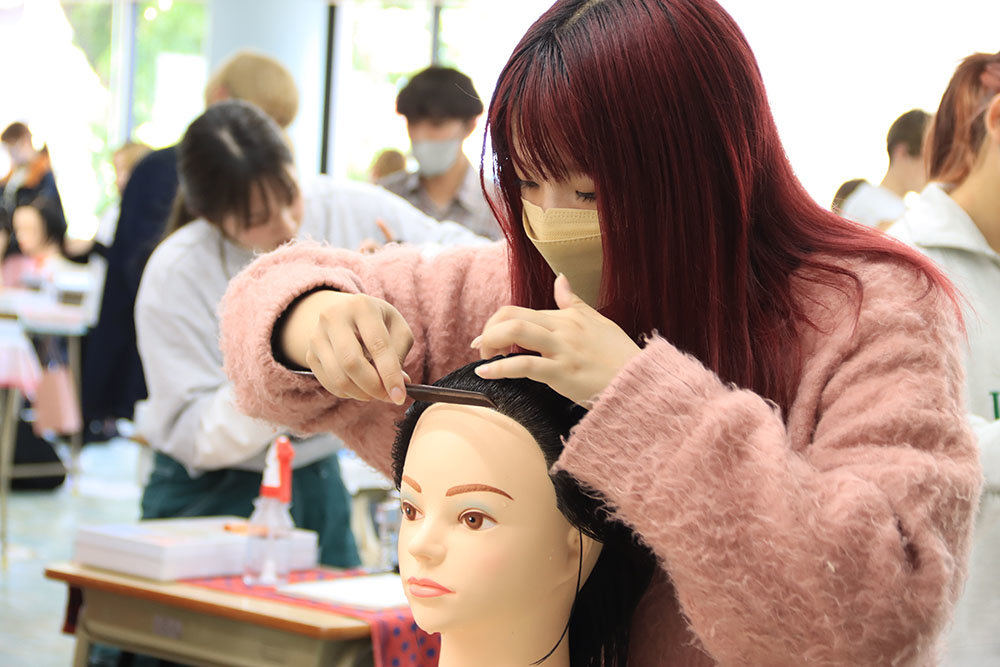 コーム(櫛)の持ち方、ウィッグ(マネキン)の髪のとかし方、ブロッキング(髪を巻くためにブロックごとに分けていく方法)を基礎から学びます。