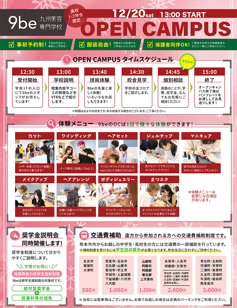 当日は学校紹介をVTRでわかりやすく、体験メニューも好きな技術を時間内でいくつでも体験できちゃいます!9be生とも仲良くなれるのでリアルな学生生活も聞くこともできますよ!また、保護者の方には奨学金説明会も同時開催します。高校1・2年生の方は早めの進路活動でちょうどいいチャンスなのでぜひみなさんでご参加ください!熊本市以外から来られる方には交通費の一部補助もありますので、学生証を忘れずにお持ちくださいね!